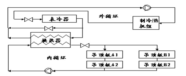 Radiation heating and cooling air conditioning systems have been used and developed in Europe and North America for many years. Unlike traditional convection air conditioning systems, radiative heat and heat transfer systems account for more than 50% of total heat exchange. The air conditioning system based on low-temperature radiation heat transfer works by inputting cold water of about 18 °C into the end of the radiation in summer to form a cold radiating surface; in winter, it provides hot water of about 45 °C to the end of the radiation to form a heat radiating surface, relying on Radiant heat exchange with the human body, furniture and the rest of the enclosure is cooled (heated). If the temperature of the hot and cold water supplied by the cold heat source is too low or too high to meet the radiation end temperature requirements, the plate heat exchanger or other methods (such as water mixing) are usually used to achieve the temperature of the cold (hot) medium. Claim.
